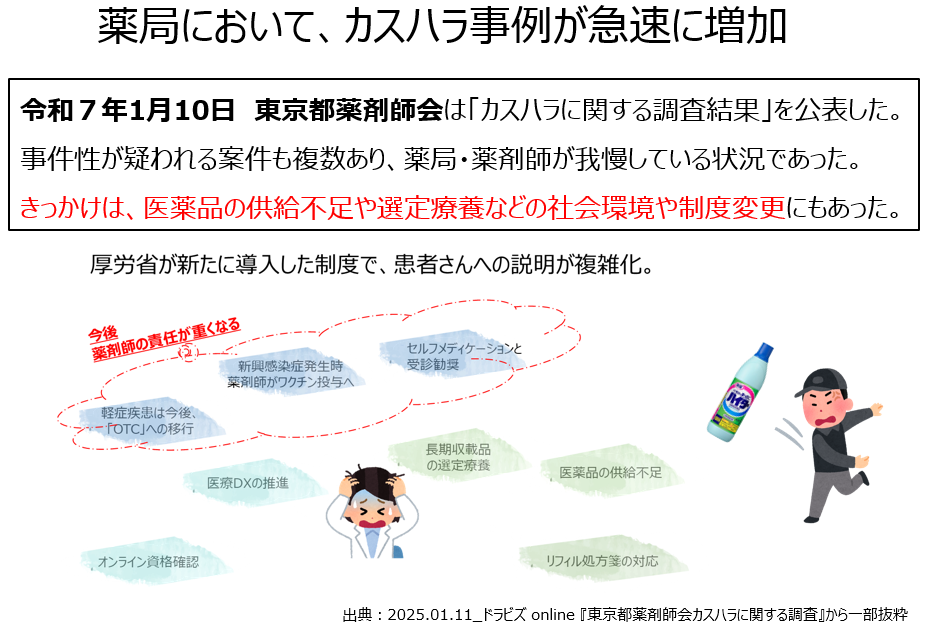 医薬品供給不安、医療DX推進、選定療養制度への対応など、薬局業務は高度化・複雑化の一途をたどっている。その一方で、現場では患者・利用者からの過度な要求や威圧的言動が顕在化し、薬剤師個人が矢面に立たされる構造が常態化している。