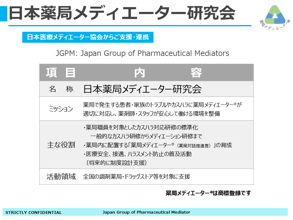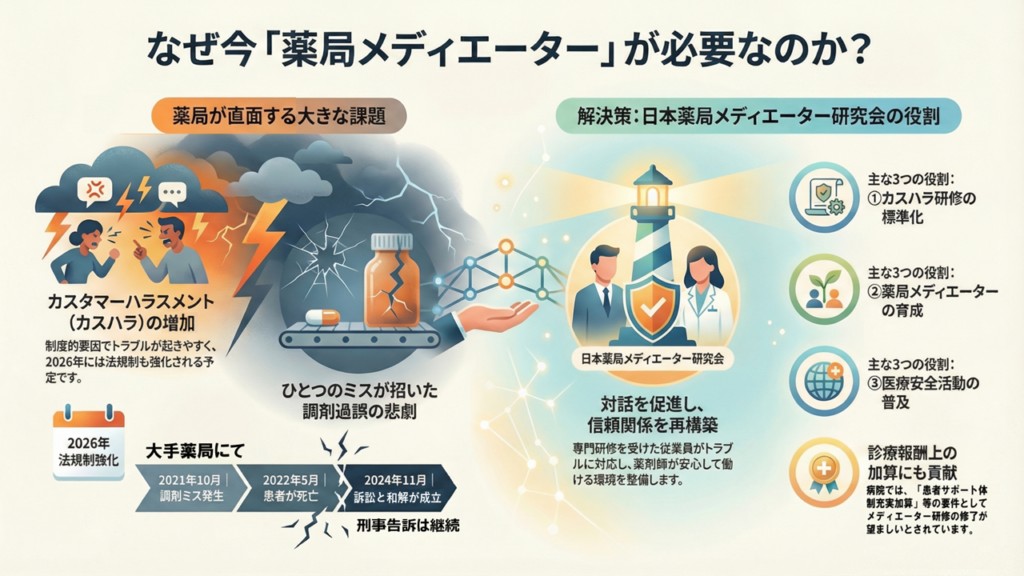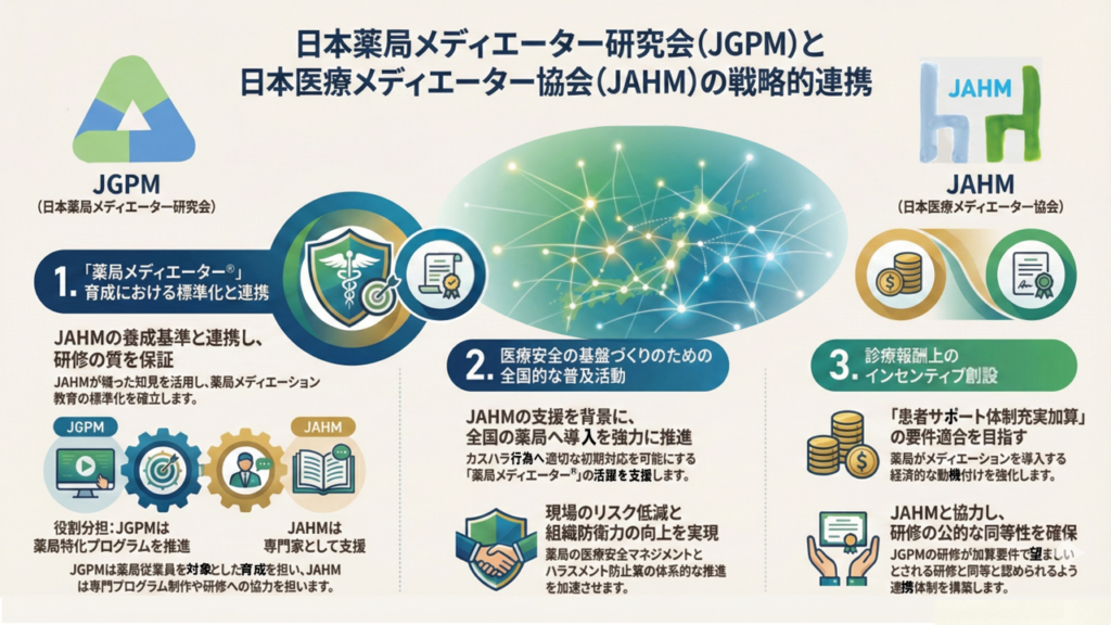 薬局の医療安全体制構築を支援する一般社団法人日本薬局メディエーター研究会(本社:大阪府大阪市、代表理事:小山成一、以下「JGPM」)は、2026年年2月、メディエーションの社会実装で国内最大の日本医療メディエーター協会(代表理事:和田仁孝、以下「JAHM」)との戦略的連携をおこなった。JAHMの公的な人材育成プログラムを薬局実務に特化させ、2026年年5月より、薬局業界で初めて「薬局メディエーター」育成事業を全国で開始する。本事業は、単なる個人対応力の向上にとどまらず、組織全体における「対話のインフラ」の構築を支援する点に特徴がある。将来的には、薬局向けの第三者認定制度の創設や、調剤領域における診療報酬上の評価制度への反映も視野に入れ、制度と現場をつなぐ新たな基盤づくりを進めていく方針である。