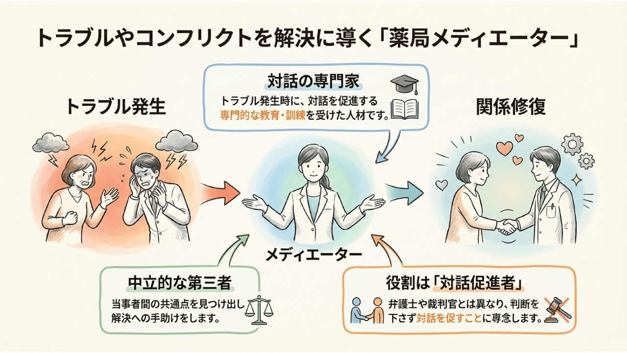 トラブルやコンフリクトを解決に導く専門家、それが「薬局メディエーター」。彼らは、単なるクレーム処理担当者ではなく、対話の促進に特化した高度な教育・訓練を受けた人材で、トラブル発生時に中立的な第三者として介入する。