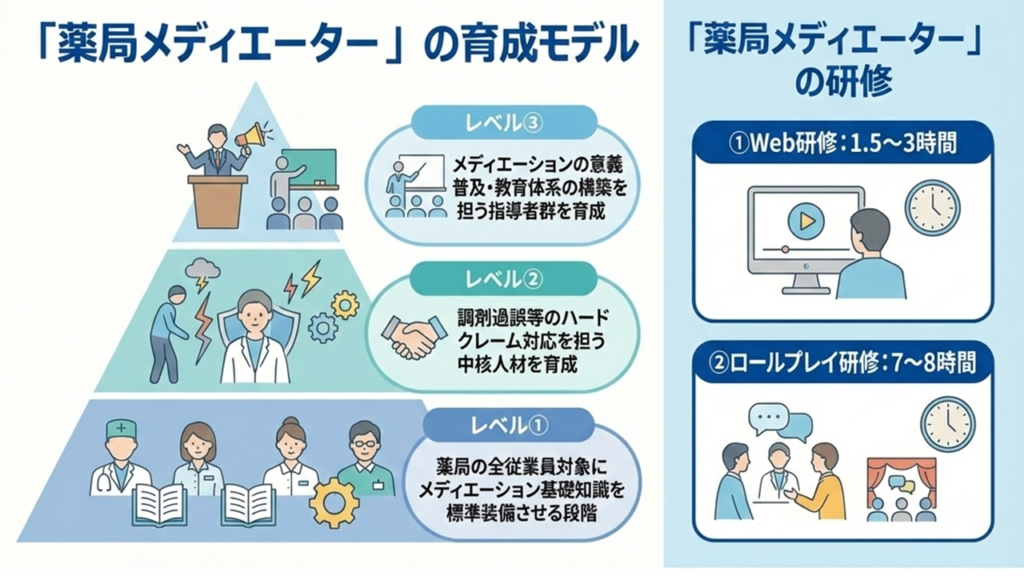将来的には、患者サポート体制充実加算等で評価されてきたメディエーション教育の公的価値を、薬局領域においても診療報酬上のインセンティブとして位置づけることを視野に入れる。